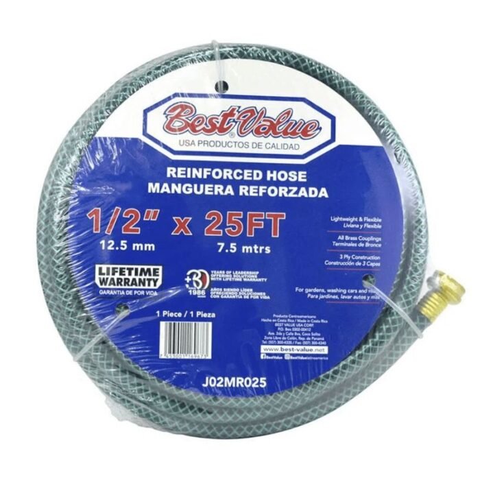 Manguera reforzada de 1/2″ x 25 pies con 4 capas de protección para máxima durabilidad. Ideal para riego de jardines, lavado de autos y uso intensivo en ferretería. Resistente a presión, torsión y perforaciones. Conexiones estándar de latón incluidos. ¡Perfecta para uso profesional y doméstico! Ahorra tiempo y dinero con esta manguera industrial de alta resistencia.